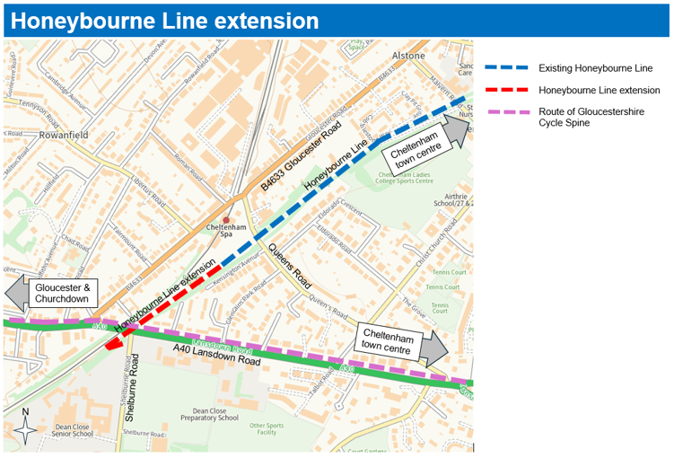 The Honeybourne Line extension will provide full access to the 26-mile cycle spine at both A40 Lansdown Road and where the Honeybourne Line joins the A435 Cheltenham to Bishop's Cleeve cycleway section at it's northern end. The scheme will support a greener Gloucestershire, help reduce carbon emissions, support improvements to public health and make it easier for people to cycle and walk to work, homes and transport hubs.