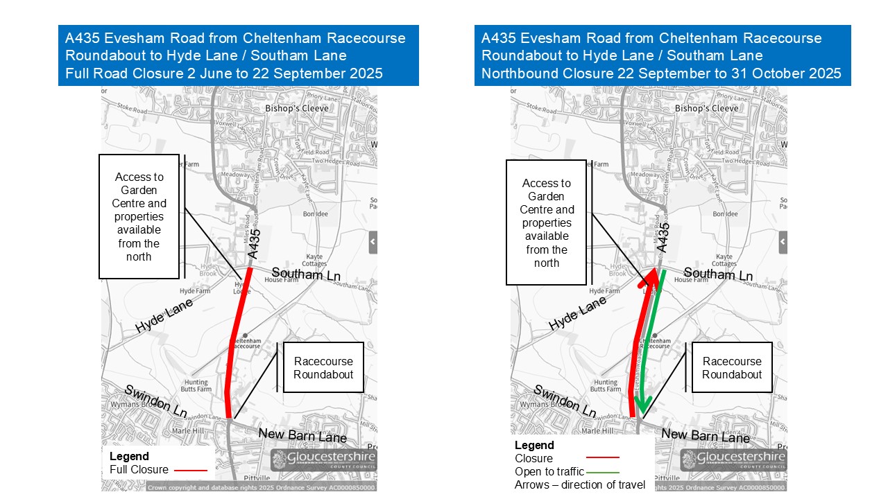 Full road closure in both directions - 2 June to 22 September 2025 (extended by two weeks in late August 2025): The A435 Evesham Road will be fully closed in both directions between the Cheltenham Racecourse roundabout and the Hyde Lane/Southam Lane junction. This full closure will allow the road over the bridge to be re-aligned to the west side of the bridge, in order to accommodate a two-way road and a new shared use cycleway and footway with protection buffer zone. Bridge strengthening and safety work is also being carried out as part of the changes. The full closure provides the required working space, will prevent damage to the structure of the bridge and protects the safety of construction workers and the public.