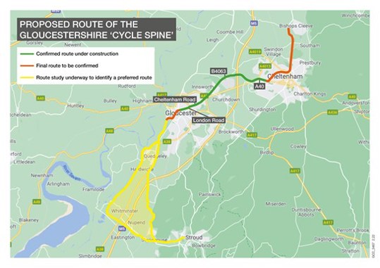 The Gloucestershire Sustainable Travel Corridor, also known as the 'Cycle Spine', will extend the Gloucester to Cheltenham cycle route, secured from other funding sources, through the city and to the docks area. This will align with existing cycleway facilities along the canal and ultimately form part of our aspiration to provide a cycle spine that extends from Stroud to Bishop’s Cleeve.
