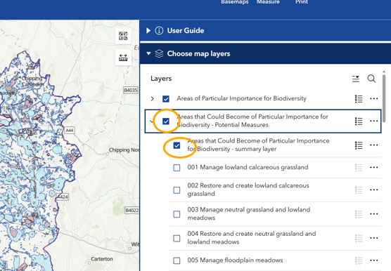 Areas that Could Become of Importance for Biodiversity – This area is made up of Potential Measures, which are mapped in areas identified as strategic for nature recovery. They show the best places for habitat creation, or management / restoration of existing sites. The habitat measures can be used to gain higher uplift on Biodiversity Net Gain projects, and have the potential to direct where funding for nature recovery projects goes.
