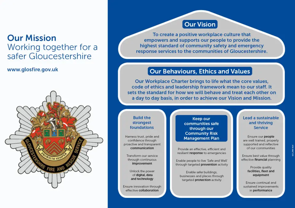 This was developed to set a clear direction for Gloucestershire Fire and Rescue Service to ensure our strategic priorities are achieved. It sets out our ambitions and is underpinned by a plan for each of the 12 commitments.