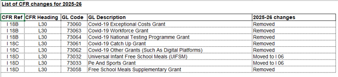 Summary list of CFR changes 2025-26: