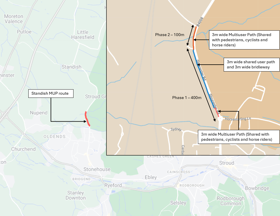 The Standish Multiuser Path (MUP) scheme aims to enhance facilities for cyclists, pedestrians and horse riders in the area. Additionally, it will contribute to CO2 reductions. The path will serve as an active travel connection between Stonehouse and Standish.